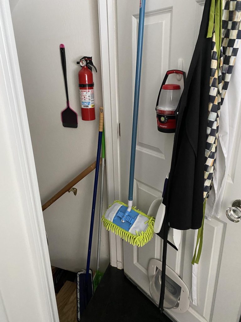 We don’t have a mudroom or a utility closet. I was able to add some hooks near the back door when we did our half bath laundry room makeover, but we don’t typically hang coats there since we need the hooks for laundry. Also there isn’t any room there to put bins. We were keeping our floor mops on the back of our basement door. The battery operated vacuum in the coat closet would fall down every time we took out a coat. The Bona mop would fall off the hook of the door sometimes and fall down the basement stairs. After this makeover we fit our coats, winter gear, bags and sweepers/mops all in one place!