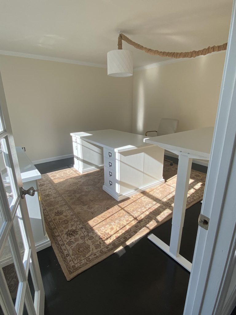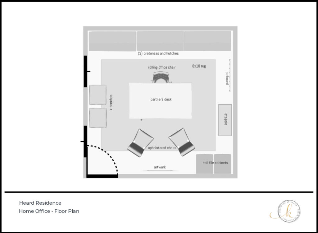 Our home office needed a redesign to make it work better as our needs have changed. When I first started working at home a couple of years ago, we turned the room in our house that was supposed to be the formal living room into an office. We bought a large partners desk, a credenza and some file cabinets and kept the bookcases and rug that we had been using in there. My husband needed a large format printer for his work, which is HUGE at 40″ wide and 24″ deep, that we also purchased that takes up a lot of space.